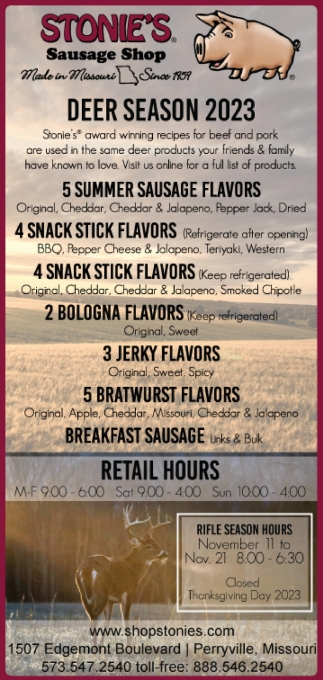 Nov 09, 2023. Stonie's Sausage Shop Food Ads from The Perryville Republic-Monitor
