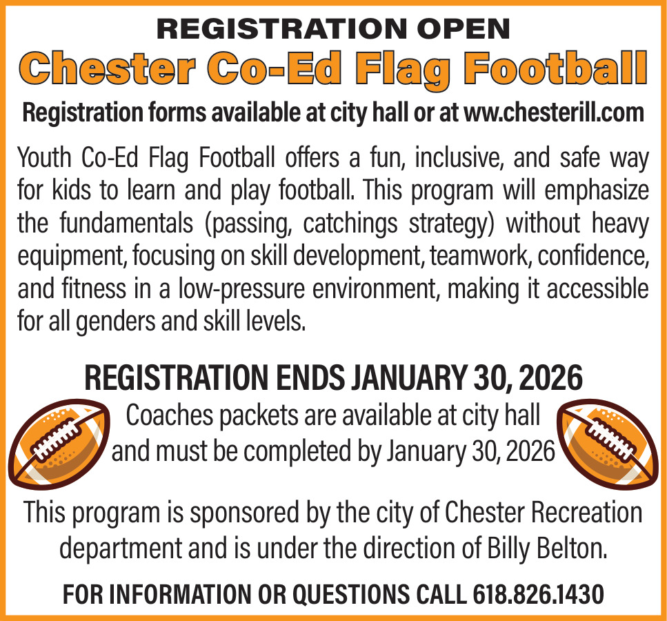 Jan 01, 2026. Chester Co-Ed Flag Football Activities Ads from The Perryville Republic-Monitor