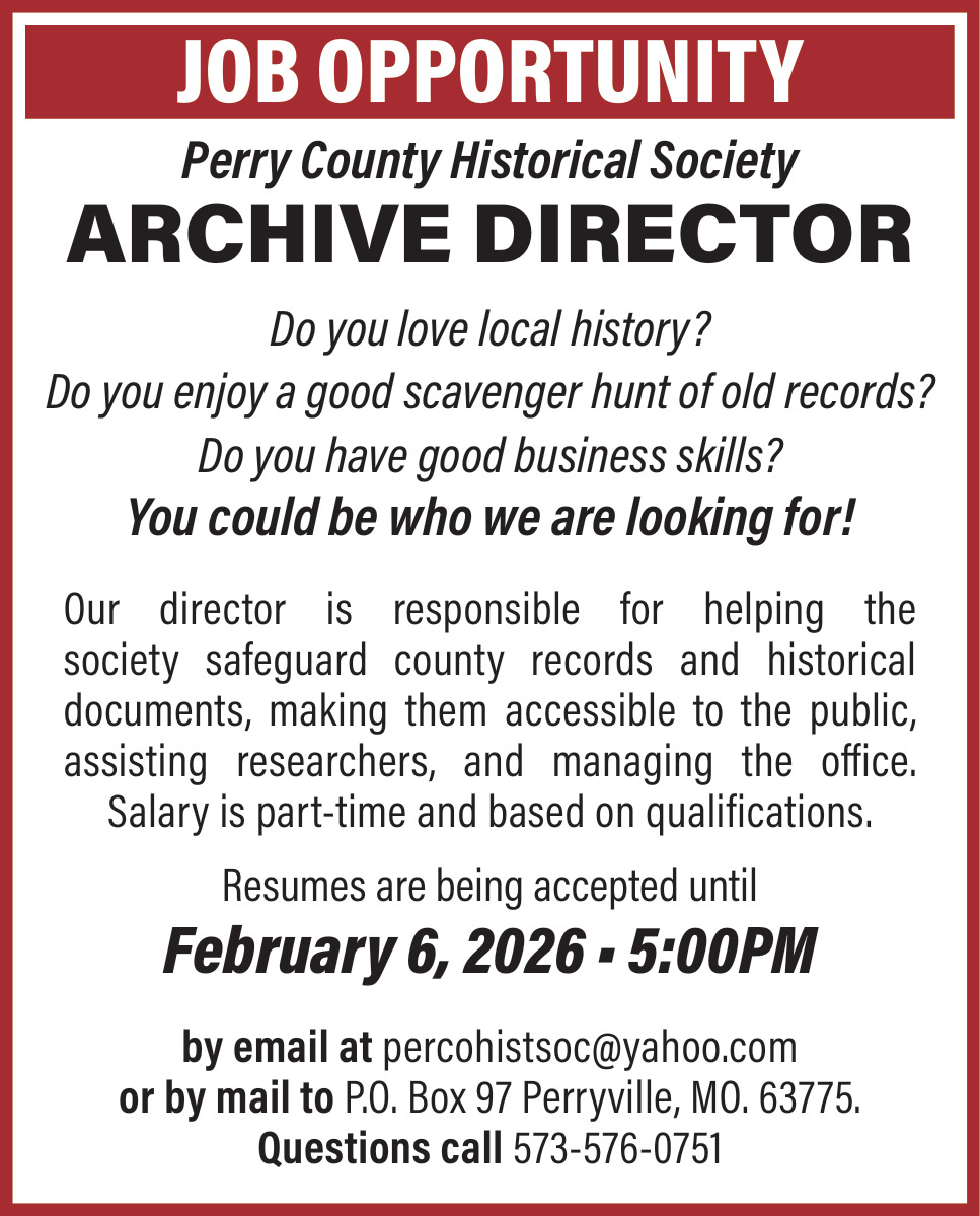 Jan 22, 2026. Perry County Historical Society Jobs Ads from The Perryville Republic-Monitor