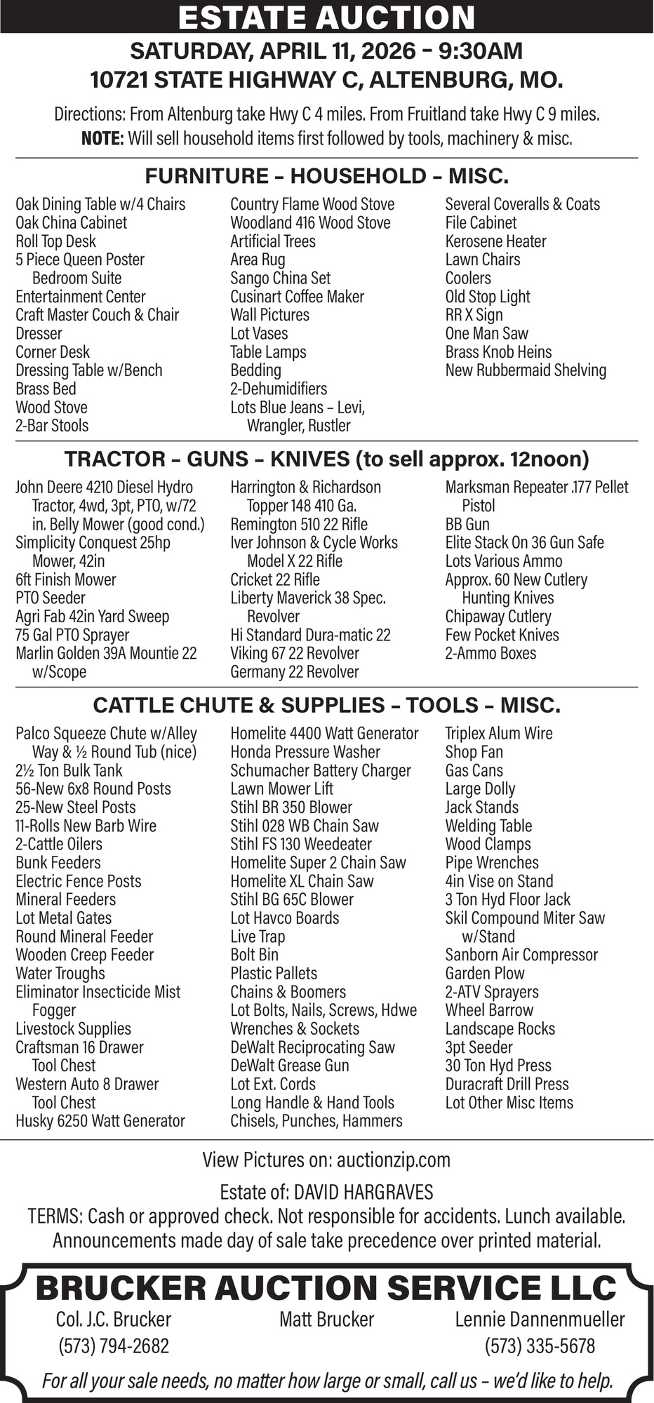 Ads for Brucker Auction Service LLC in Chaffee, MO
